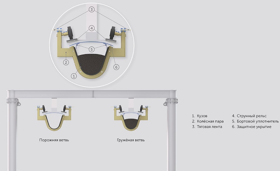 Юнитранс – это надземная автоматизированная система с непрерывным кольцевым движением, предназначенная для транспортировки навалочных (сыпучих) материалов без промежуточных перевалок. Технология обеспечивает производительность до 100 млн тонн в год и работу в режиме 24/7.